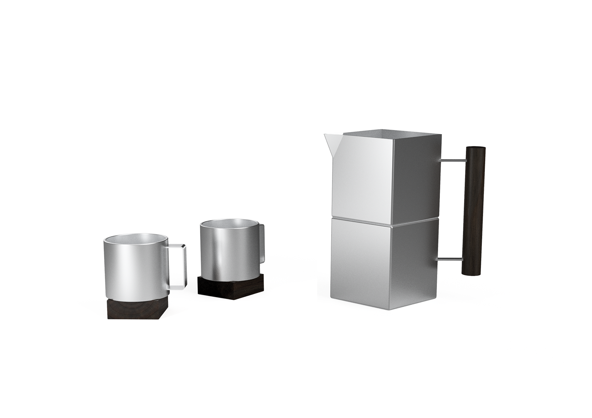"Prima Forma" is a collection of coffee-related objects, including a moka pot, a carafe, and a set of cups, made from aluminium and wood.