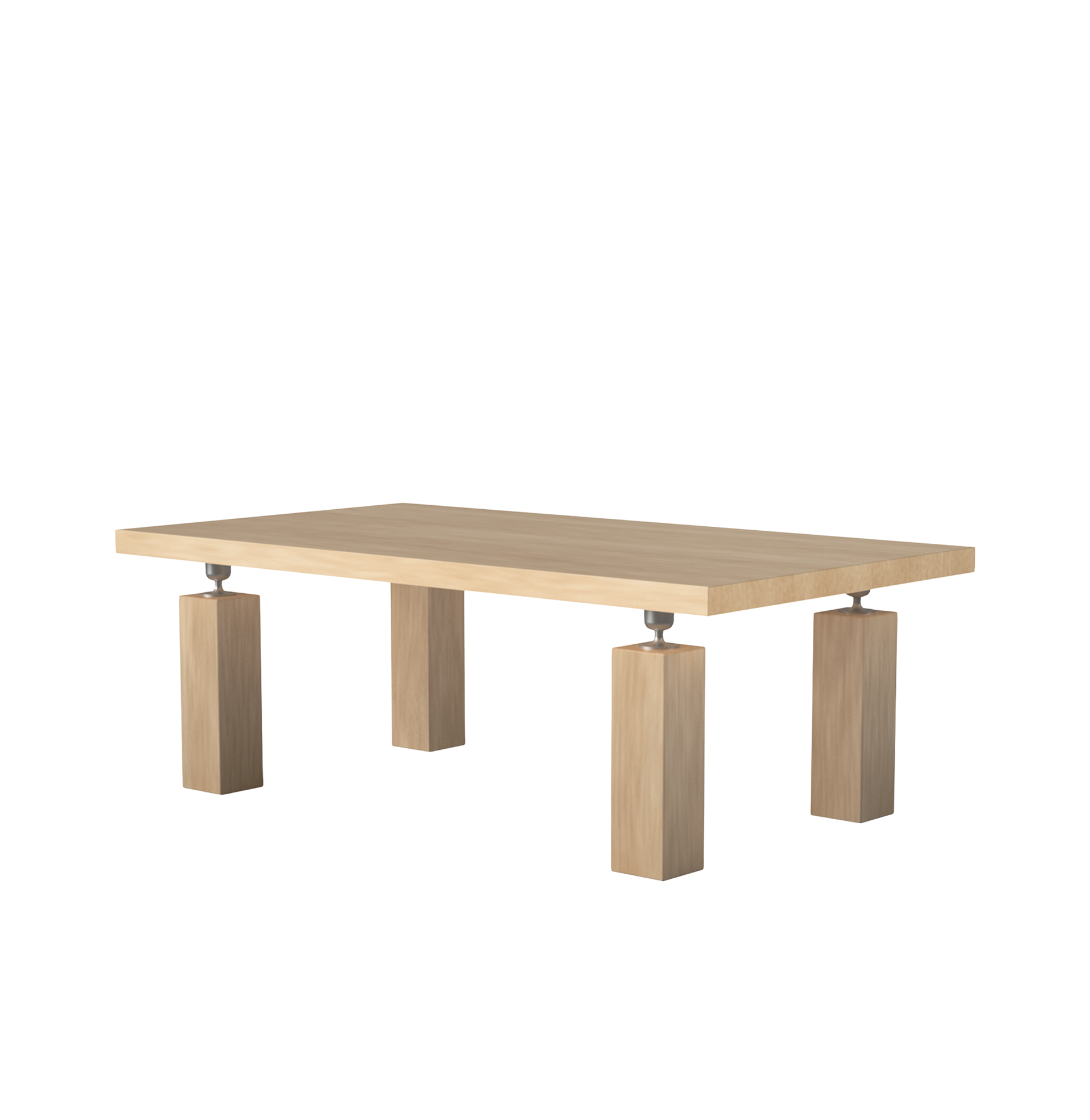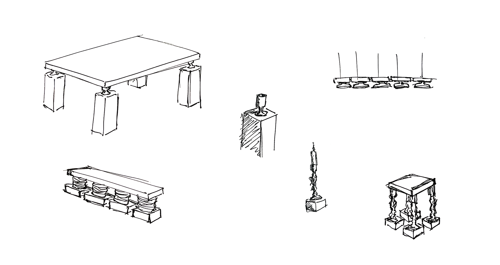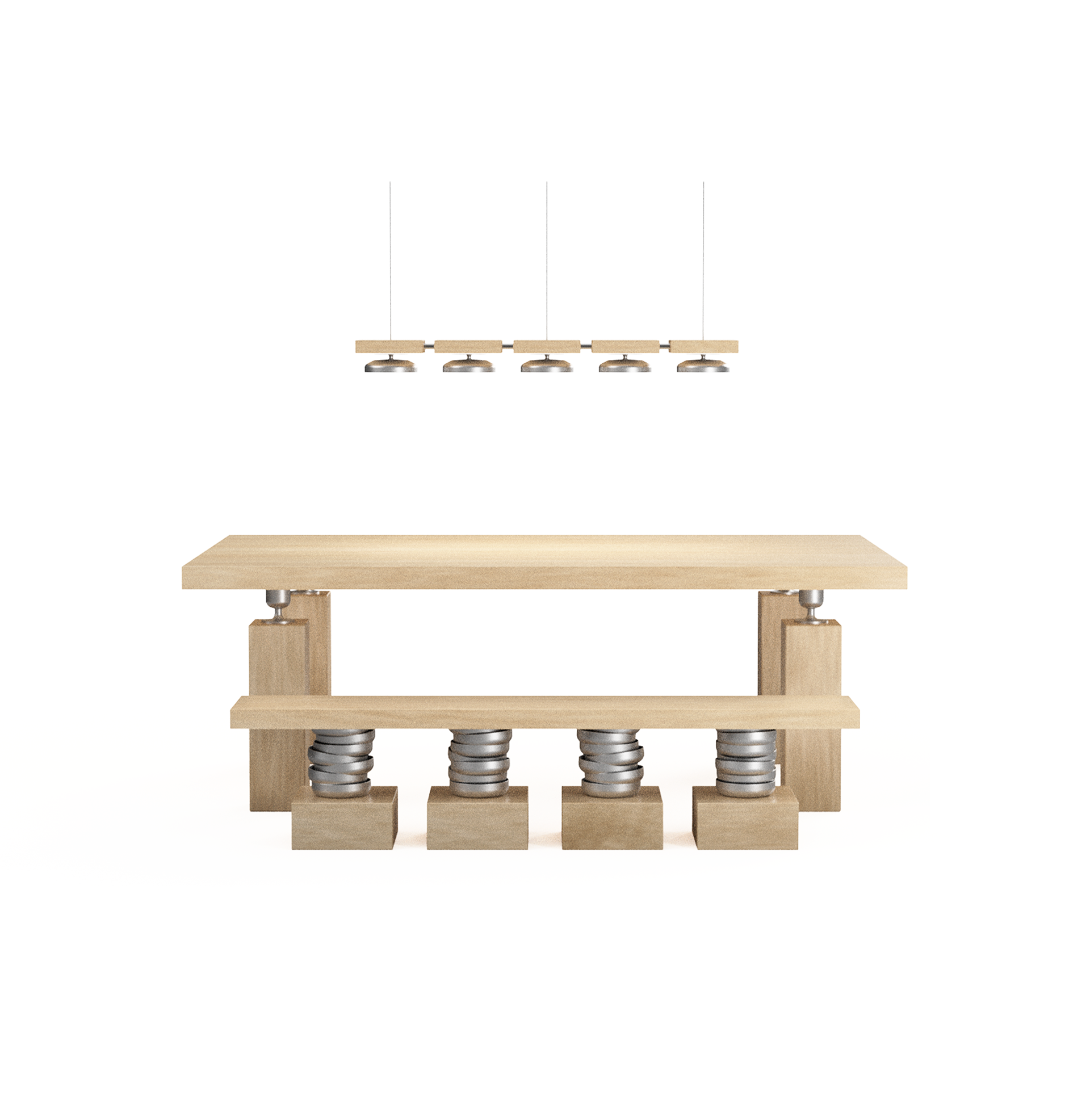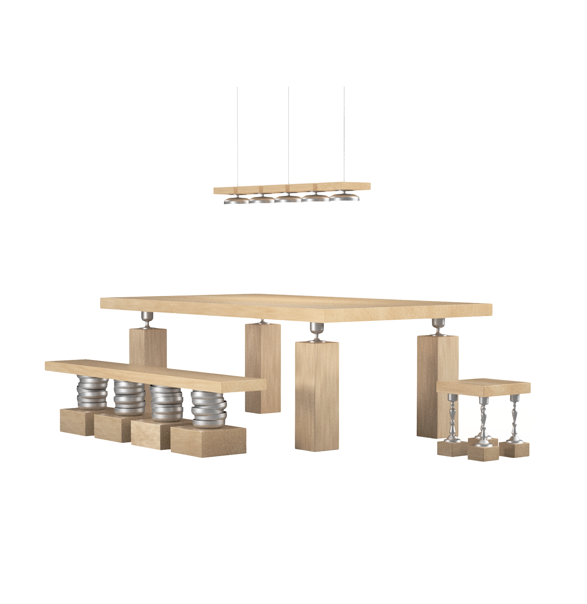 “Semantic Vessels” is a wooden furniture collection composed of a table, bench, stool, and suspended lamp integrating aluminum plates, bowls, cups, and candle holders within their structure.